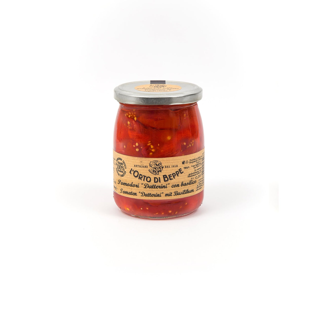 Sonnengereift, aromatisch und typisch italienisch: Diese Datterini-Tomaten mit Basilikum überzeugen durch ihre natürliche Süße und ihre weiche Konsistenz. Sorgfältig eingelegt und mit frischem Basilikum verfeinert, bewahren sie ihr volles Aroma und sind somit perfekt für mediterrane Gerichte geeignet.