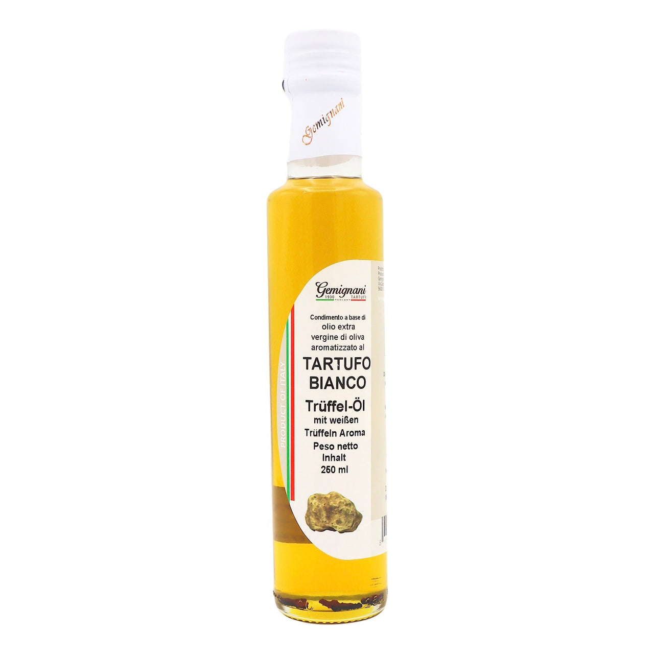 Das weiße Trüffelöl mit Trüffelstücken von Gemignani Tartufi verleiht Ihrer Küche einen edlen Gourmet-Charakter. Das Olio al Tartufo Biancobasiert auf hochwertigem nativem Olivenöl Extra, ist mit dem Aroma weißer Trüffel angereichert und enthält sichtbare Trüffelstückchen – eine exquisite italienische Spezialität.