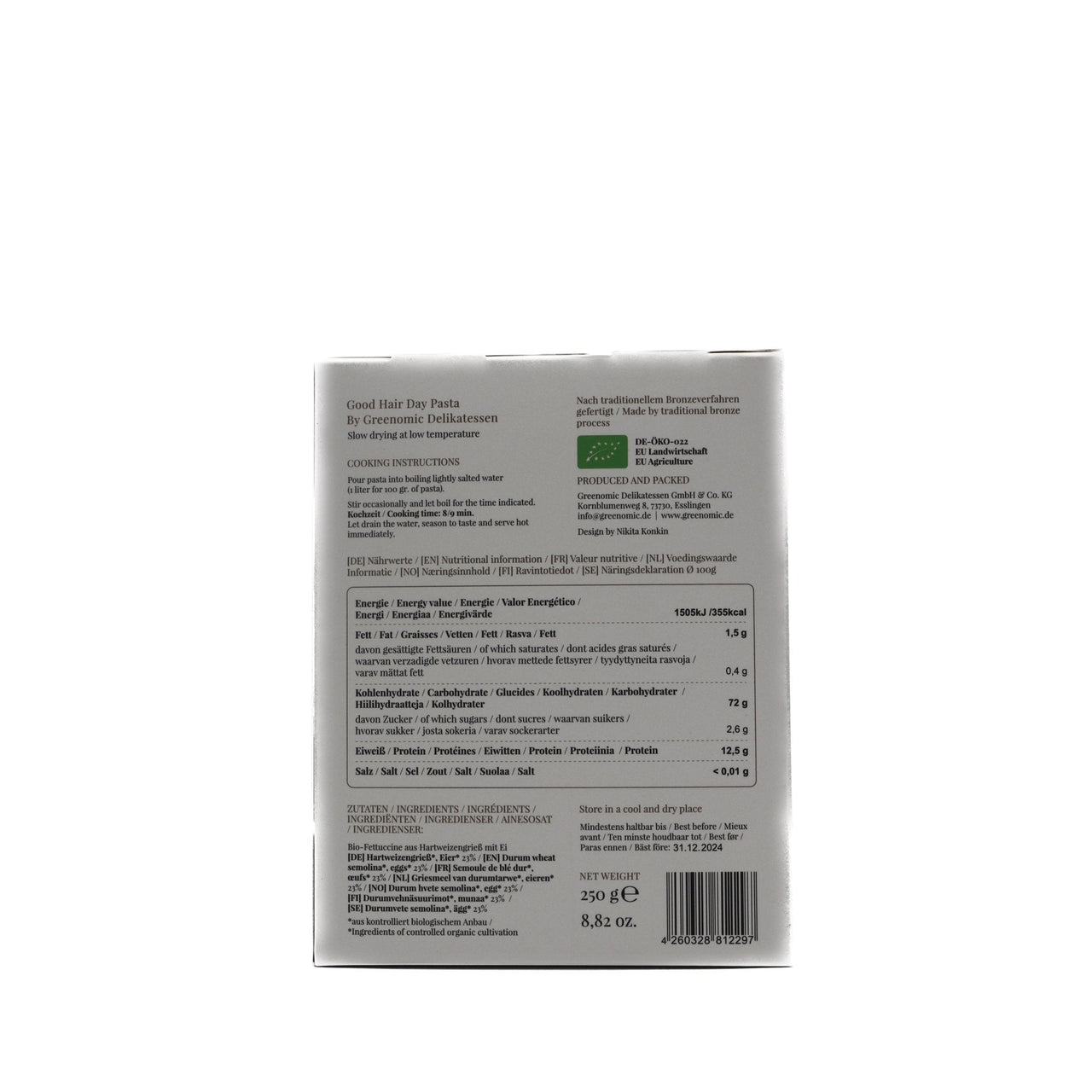 Klassisch, biologisch, hochwertig: Die Fettuccine Classic (Bio) von Good Hair Day Pasta stehen für puren Pastagenuss aus besten Zutaten. Hergestellt aus biologisch angebautem Hartweizengrieß und nach dem traditionellen Bronzeverfahren verarbeitet, überzeugt diese Pasta durch Qualität und Textur.
