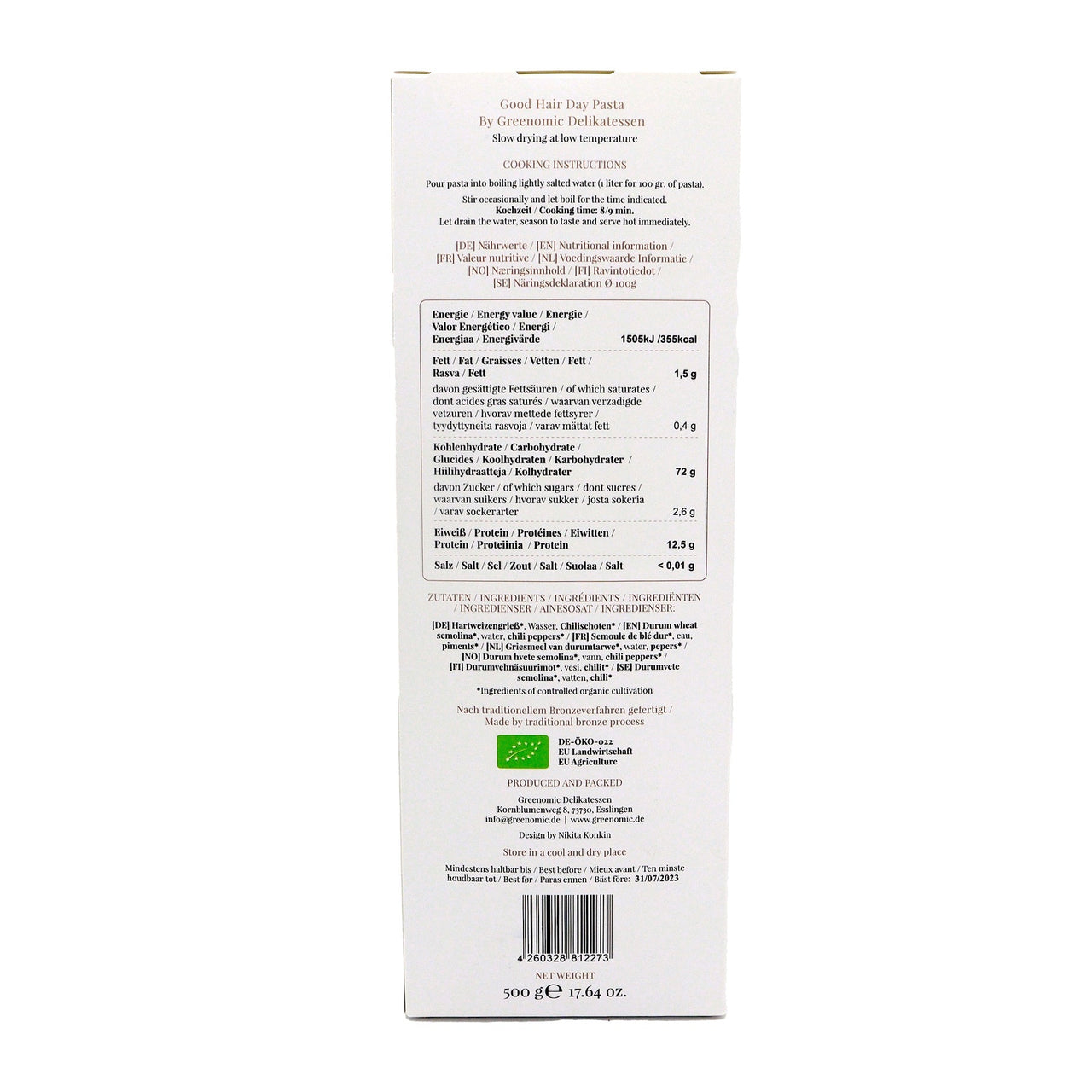 Als Teil der stilvollen „Good Hair Day“-Pasta-Serie überzeugt diese Seppia-Pasta nicht nur durch Bio-Qualität und Handwerkskunst, sondern auch durch ihren eleganten Auftritt. Sie eignet sich perfekt für Fischgerichte, Meeresfrüchte-Soßen oder auch als raffinierter Akzent in kreativen Rezepten. Ihre bissfeste Textur und natürliche Herstellung machen diese Spaghetti zu einer besonderen Delikatesse für Feinschmecker.