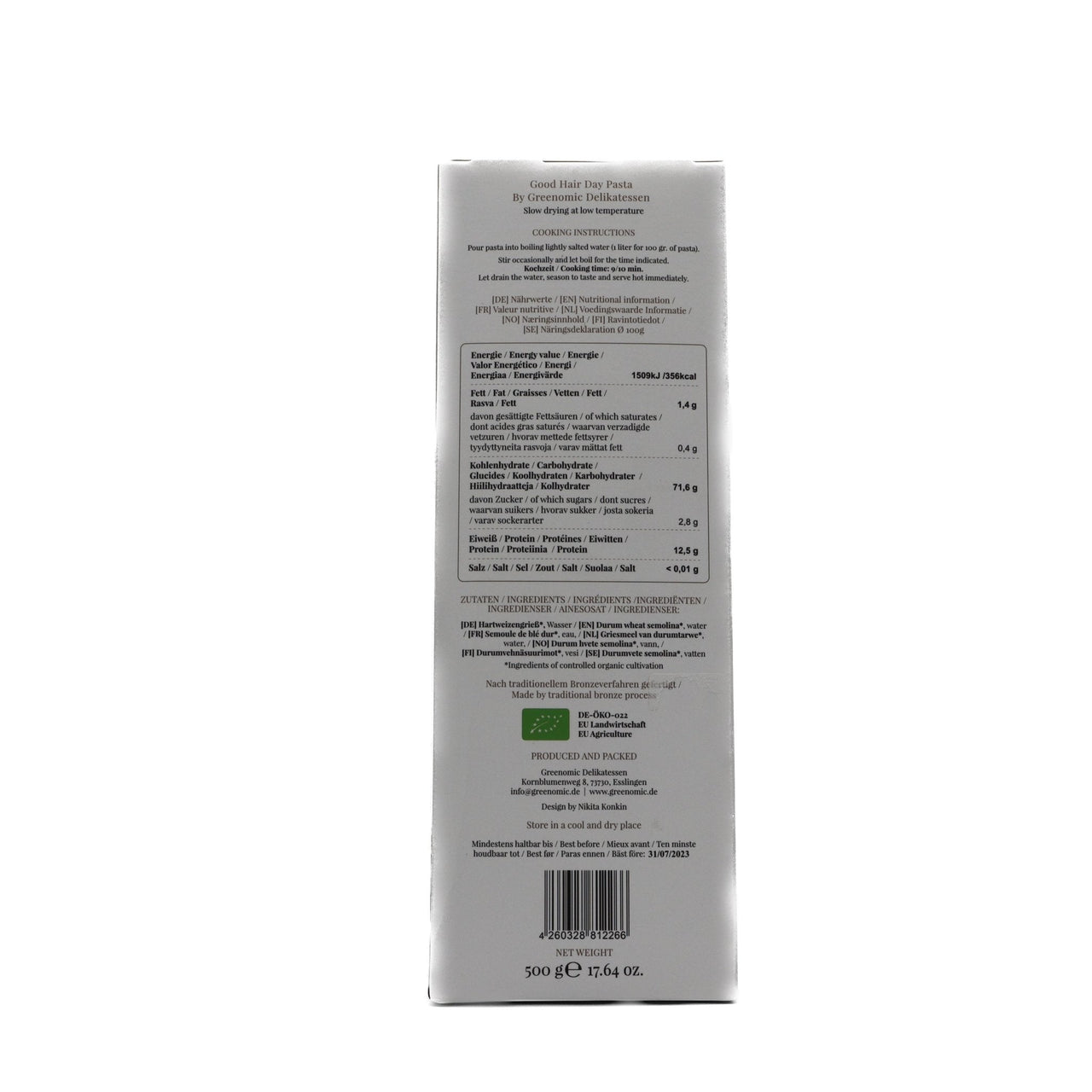 Sie bietet eine perfekte Bissfestigkeit und passt hervorragend zu klassischen italienischen Rezepten – von frischen Tomatensaucen bis hin zu feinem Pesto oder Olivenöl mit Knoblauch. Dank ihrer dezenten Eleganz eignet sich die Verpackung zudem ideal als Geschenk für Genussliebhaber. Greenomic steht für authentische Qualität, bewusstes Genießen und modernes Design.