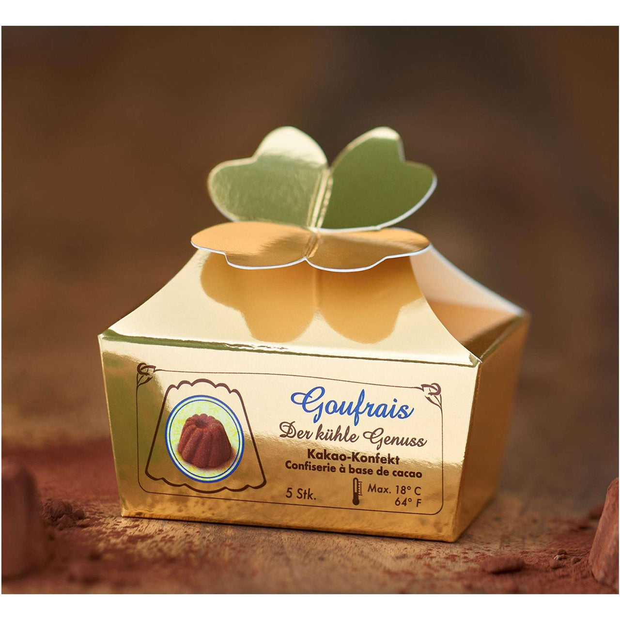 Das Goufrais Kakao-Konfekt im 5er-Pack ist die perfekte kleine Aufmerksamkeit für zwischendurch. Hergestellt in Deutschland, überzeugt das zarte Konfekt durch seinen intensiven Kakaogeschmack, die typische Gugelhupfform und den angenehm kühlen Schmelz - ganz ohne Alkohol und ohne Nüsse.