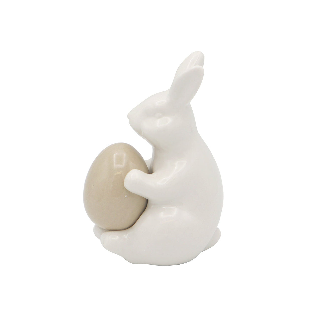 Dieser liebevoll gestaltete Keramikhase bringt österlichen Charme in jedes Zuhause. In seinen Armen hält er ein zart bemaltes Ei der Trendfarbe greige (einer Mischung aus grau und beige) – ein Symbol für Frühling, Neubeginn und liebevolle Dekoration.