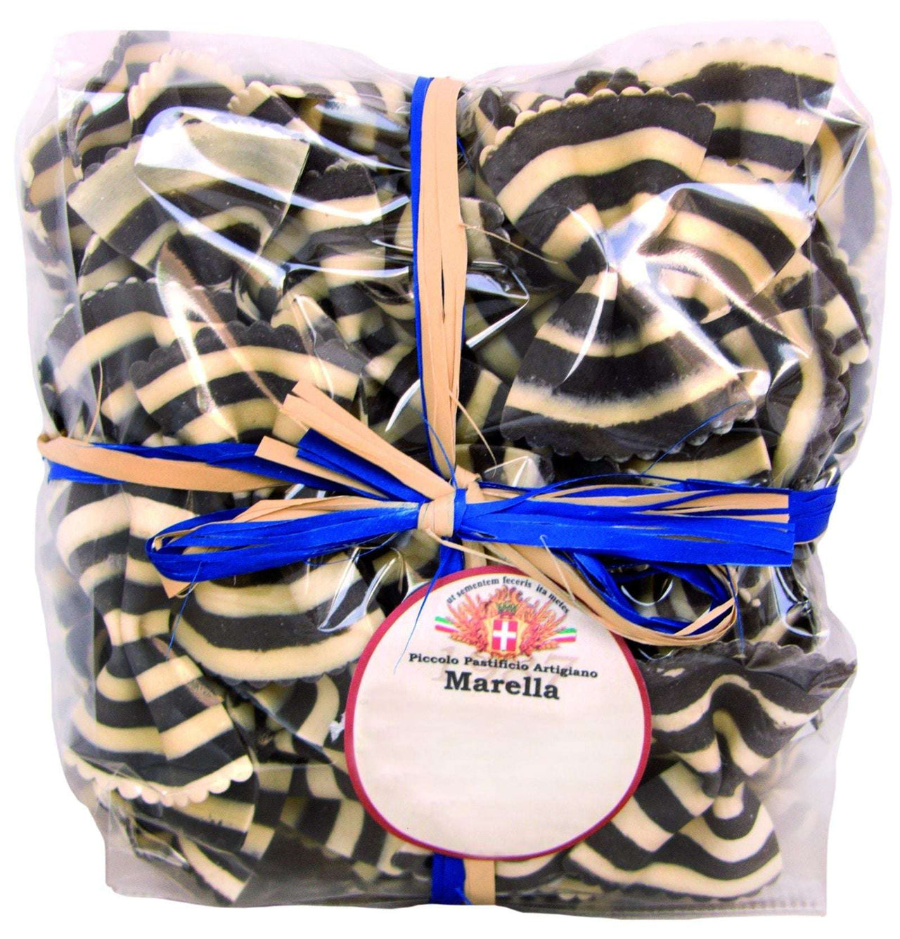 Die Farfalle Zebranudeln von Pasta Marella sind ein echter Hingucker: Ihre markanten schwarz-weißen Streifen entstehen durch die Zugabe von natürlicher Sepiatinte zum Hartweizengrießteig.