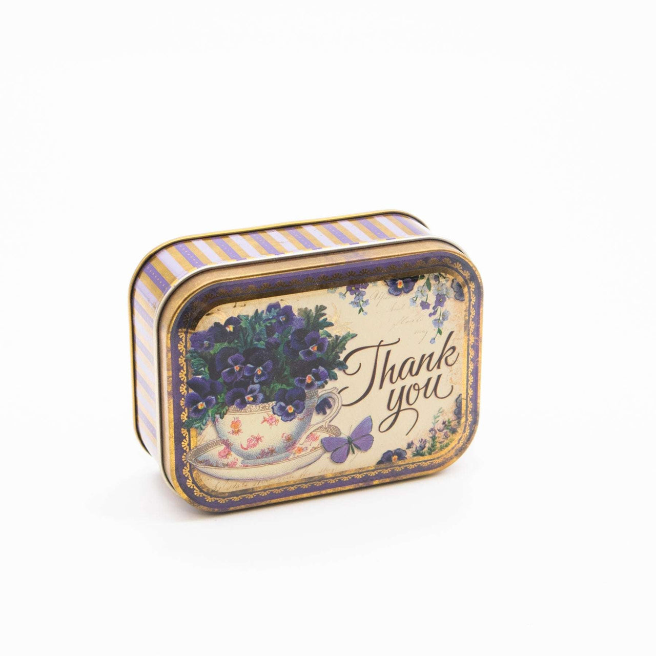 Ihr Design besticht durch ein florales Motiv mit zarten, blauen Stiefmütterchen und der charmanten Aufschrift „Thank You“ auf dem Deckel. Die Kombination aus Vintage-Look und floraler Eleganz macht diese Dose zu einem vielseitigen Deko-Objekt für jede Gelegenheit – sei es als Dankeschön, als Mitbringsel oder einfach als besonderes Detail in Ihrem Zuhause.