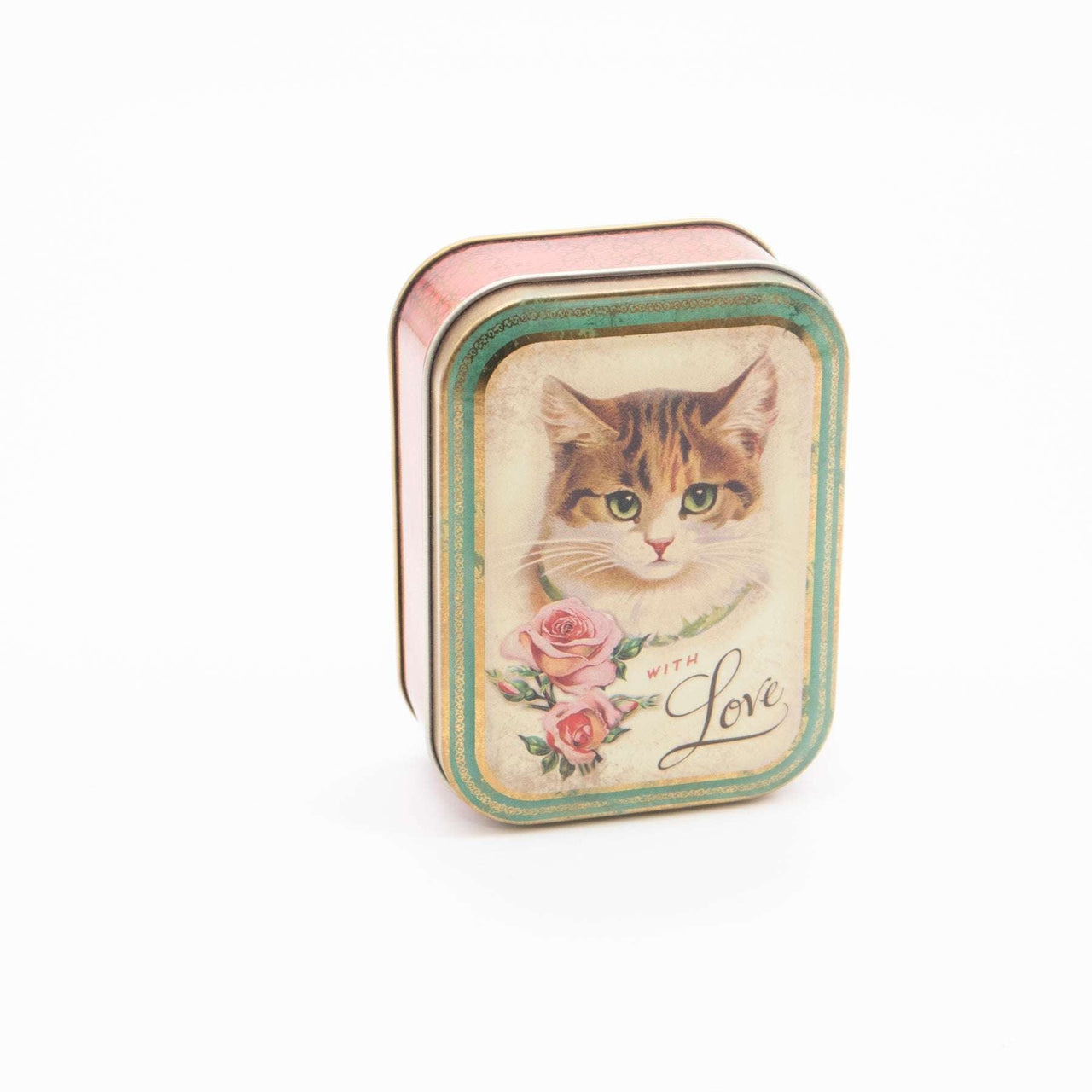 Das Motiv zeigt eine niedliche Katze zwischen zarten Rosen und ist mit der Aufschrift „With Love“ versehen. Die Gestaltung vereint einen romantischen Vintage-Stil mit einer verspielten Illustration und ist somit ideal als liebevolle Geste oder als Dekoration auf dem Schreibtisch oder im Regal geeignet.