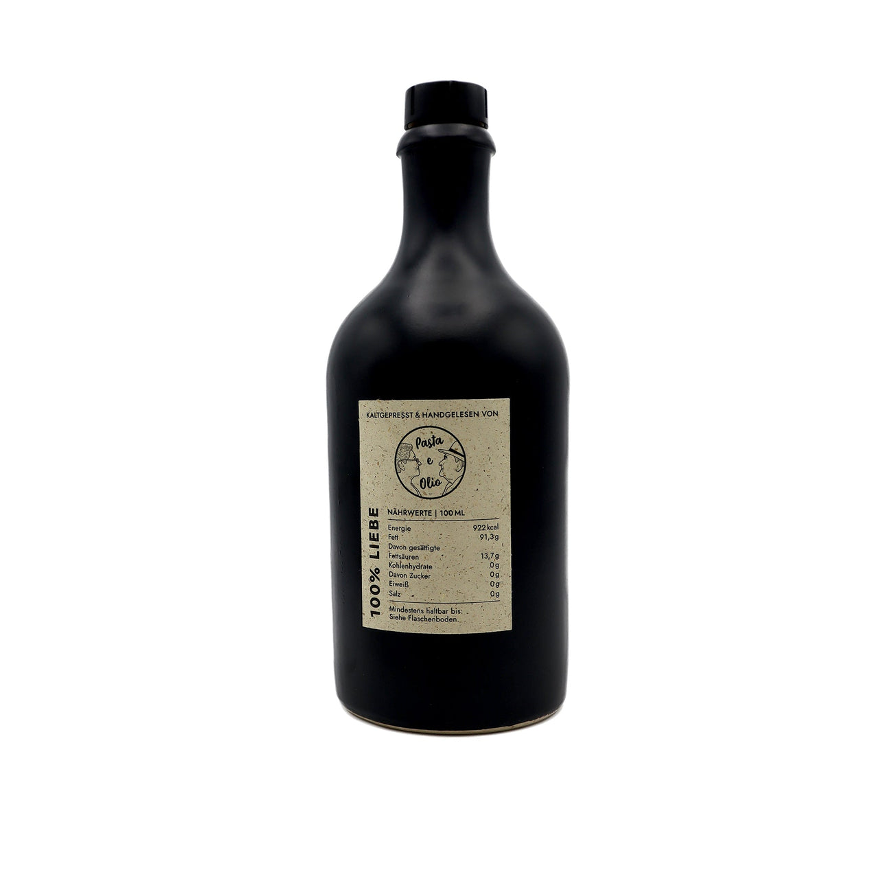 In der eleganten schwarzen Tongutflasche mit 500 ml Inhalt ist das Öl optimal vor Licht geschützt - ideal für alle, die höchste Qualität mit stilvollem Design verbinden. Ob zu Antipasti, Pasta, Salat oder einfach pur auf frischem Brot: Dieses Olivenöl überzeugt durch seinen unverwechselbaren Charakter und authentischen Geschmack.