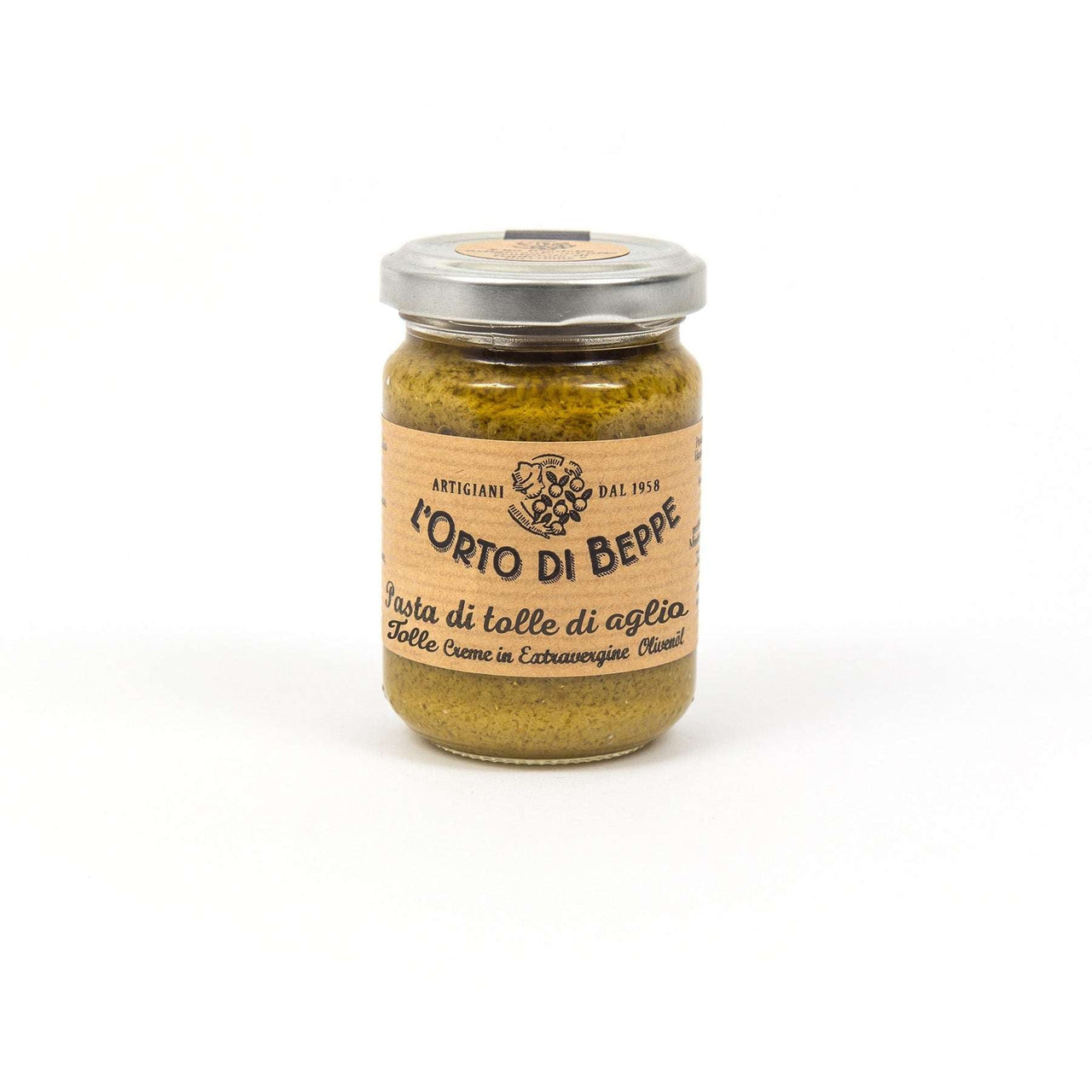 Die rote Schnittknoblauch-Creme, auch Pasta di Tolle di Aglio Rosso di Sulmona genannt, ist eine italienische Delikatesse, die aus den zarten Blütenstielen des roten Knoblauchs aus Sulmona hergestellt wird. Sie bietet ein intensives Aroma mit angenehmer Schärfe und ist vielseitig einsetzbar. Ob als Brotaufstrich, Dip oder zur Verfeinerung von Pasta-Gerichten – sie verleiht Ihren Speisen eine besondere Note.