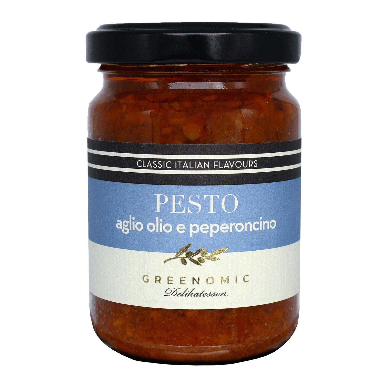 Erleben Sie den typisch italienischen Geschmack mit Pesto Aglio Olio Peperoncino - einer aromatischen Komposition aus Knoblauch, Olivenöl und Peperoncino. Die würzige Mischung verleiht Ihren Gerichten eine angenehme Schärfe und sorgt für ein unvergleichliches Geschmackserlebnis.
