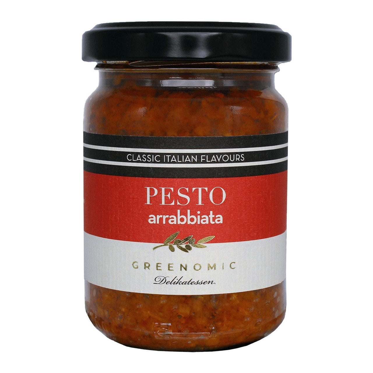 Mit dem Pesto Arrabiata von Greenomic erleben Sie ein würzig-scharfes Geschmackserlebnis, das jede Mahlzeit veredelt. Diese pikante Pesto-Variante kombiniert sonnengetrocknete Tomaten mit aromatischem Knoblauch und einer feinen Paprikanote. Rote Chilischoten verleihen dem Pesto seinen charakteristischen, feurigen Kick.
