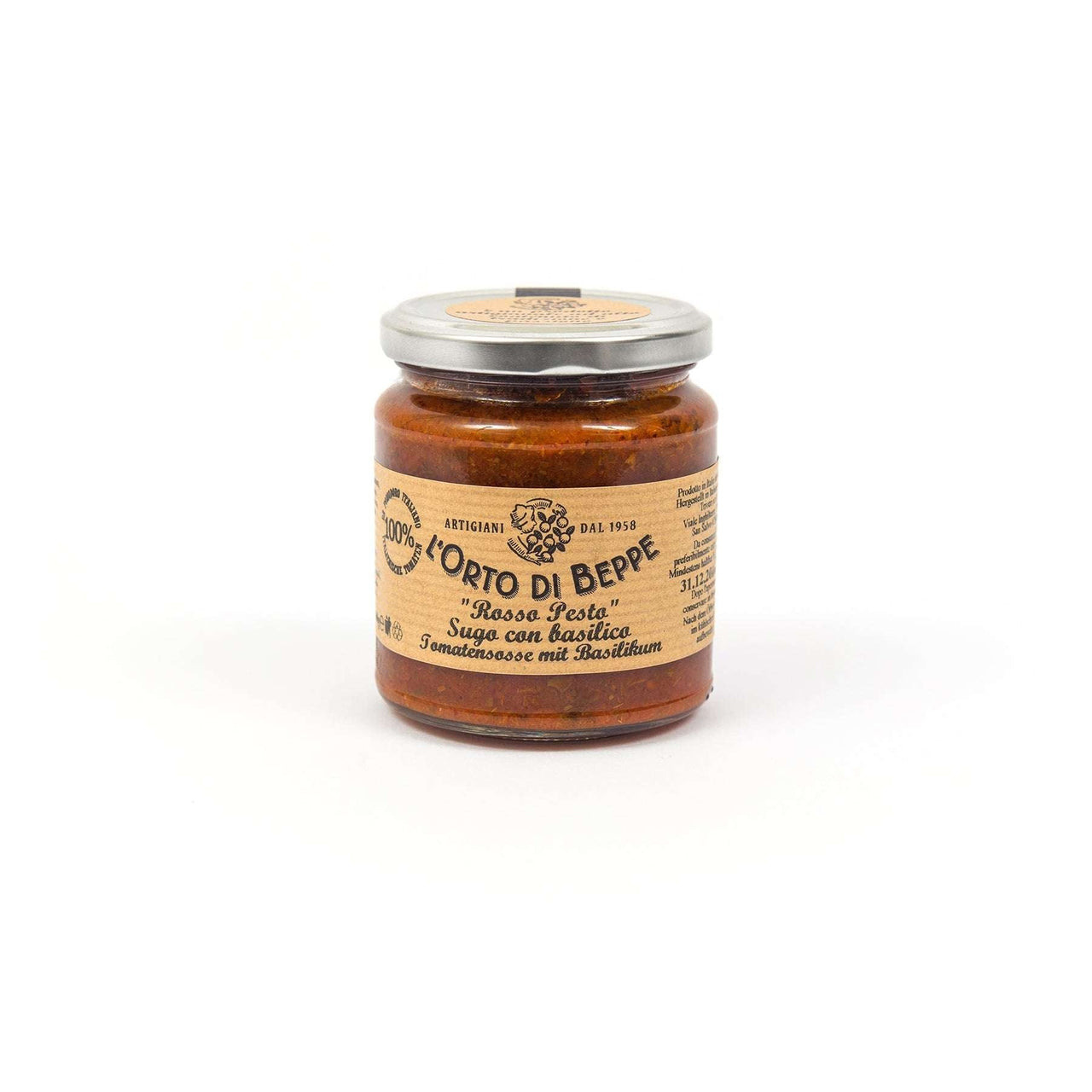 Dieses Tomatenpesto mit Basilikum besticht durch seine mediterrane Komposition aus sonnengereiften Tomaten, frischem Basilikum und feinem nativem Olivenöl extra. Abgerundet mit Knoblauch, einer Prise Salz und der feinen Schärfe von Peperoncini entsteht ein Rosso Pesto, das kräftig und ausgewogen im Geschmack ist.