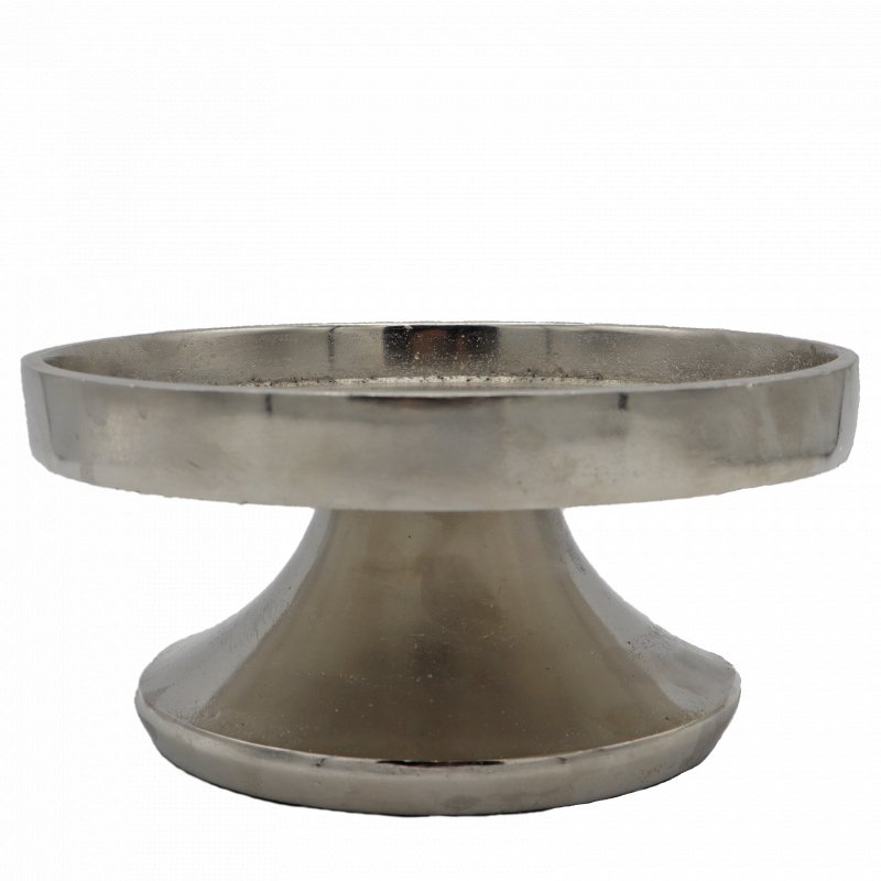 Die silberne Optik verleiht dem runden Teller eine elegante Ausstrahlung, während der stabile Standfuß für sicheren Halt sorgt. Ob auf dem festlich gedeckten Tisch, auf dem Sideboard oder als zentrales Deko-Element: Der kleine Standteller passt in jede Umgebung und lässt sich vielseitig gestalten.