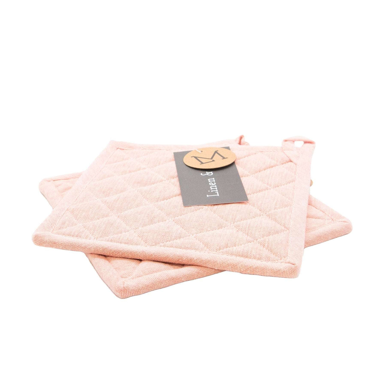 Setzen Sie mit diesem Topflappen-Set in zartem Pfirsichton einen warmen Farbakzent in Ihrer Küche. Die beiden Topflappen aus strapazierfähiger Baumwolle verbinden praktischen Nutzen mit dekorativem Effekt. Das moderne Design passt sich mühelos verschiedenen Küchenstilen an - von natürlich bis minimalistisch.