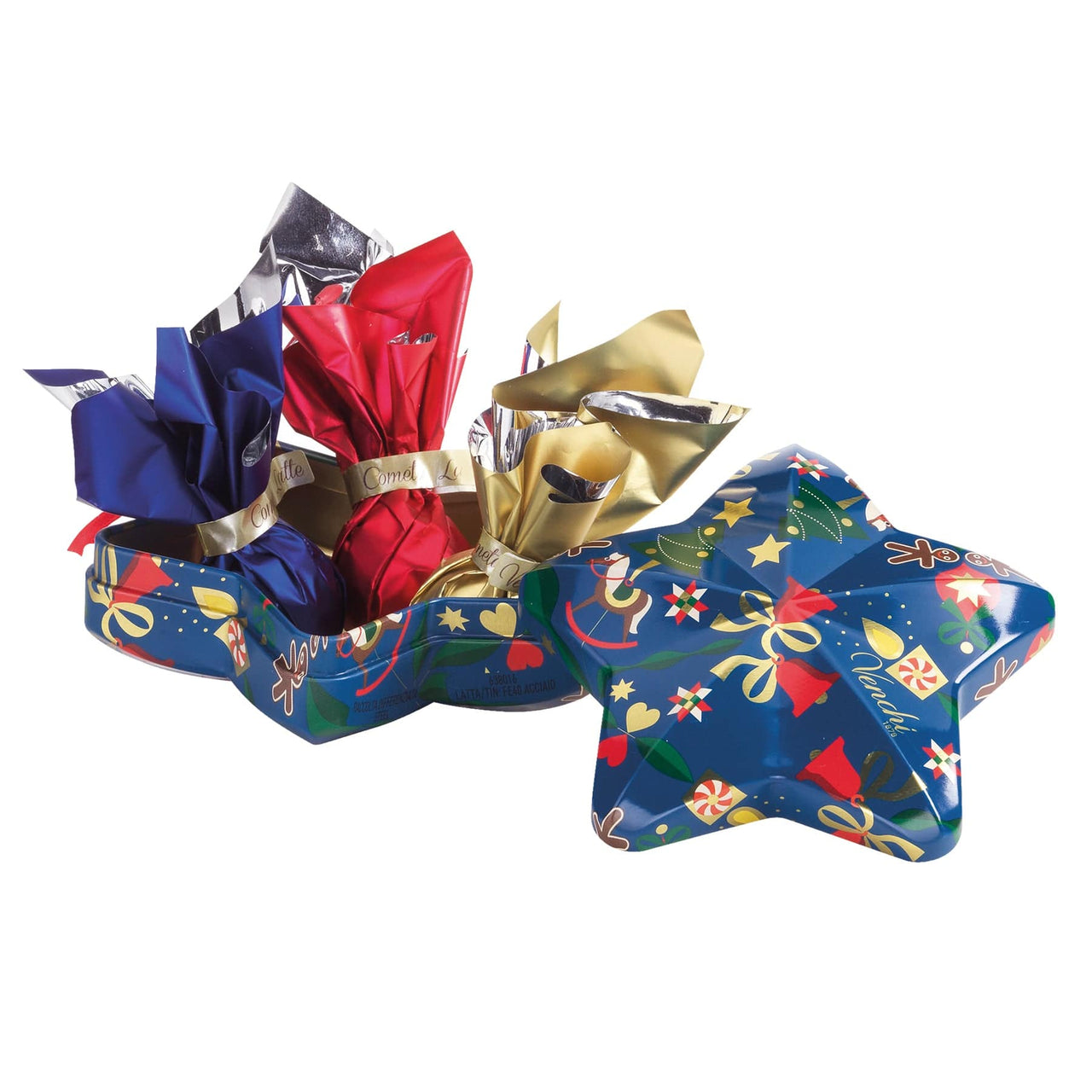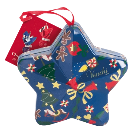 Die blaue Stern-Geschenkdose aus Metall von Venchi vereint edles Design mit feinster italienischer Schokoladenkunst. Mit einem Bändchen zum Aufhängen gestaltet, ist sie nicht nur ein stilvolles Dekoelement, sondern auch ein köstliches Geschenk für die Weihnachtszeit.